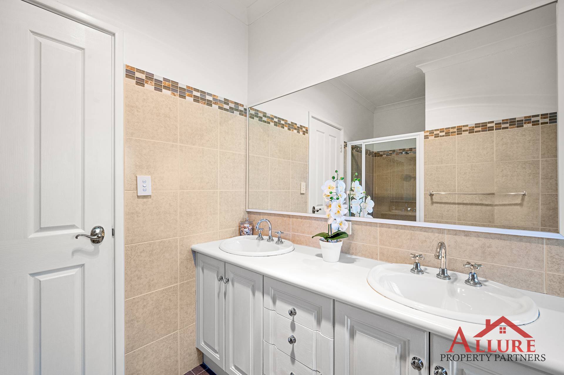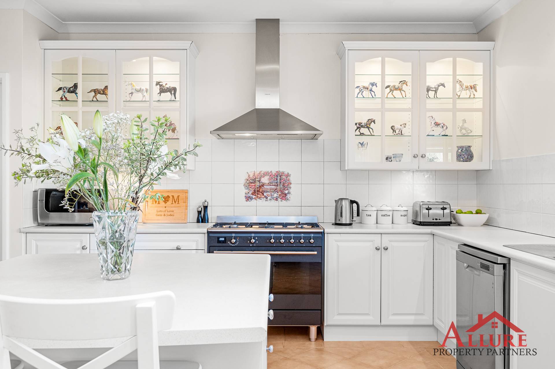 The beautiful classic style farmhouse kitchen is situated at the helm of the home looking out onto the pool and patio area which internally overlooks the dining and family living areas. The chef of the family will be in their element cooking their favorite dishes, comes complete with an island bench space, gas cooktop with range hood, dishwasher, no shortage of storage space with masses of cupboard space and a substantial walk-in pantry.