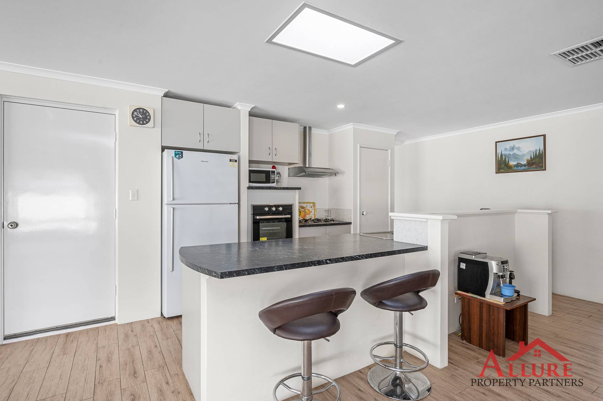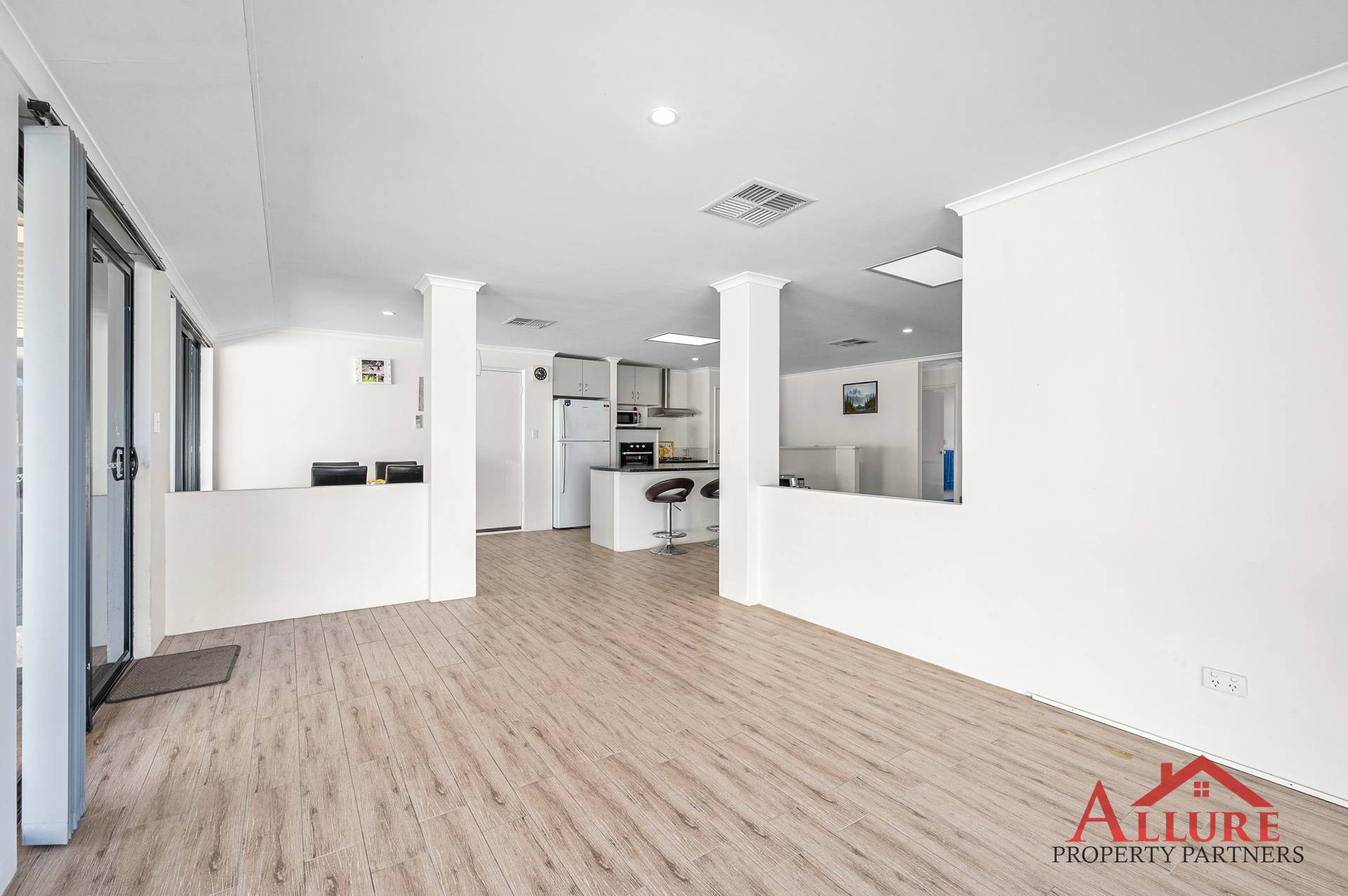 The open plan kitchen offers a breakfast bar, gas cooktop and large fridge recess which overlooks the family living, dining, and games rooms. The shopper’s entry directly from the carport into the kitchen provides convenience of unloading the shopping and protection from all weather conditions.