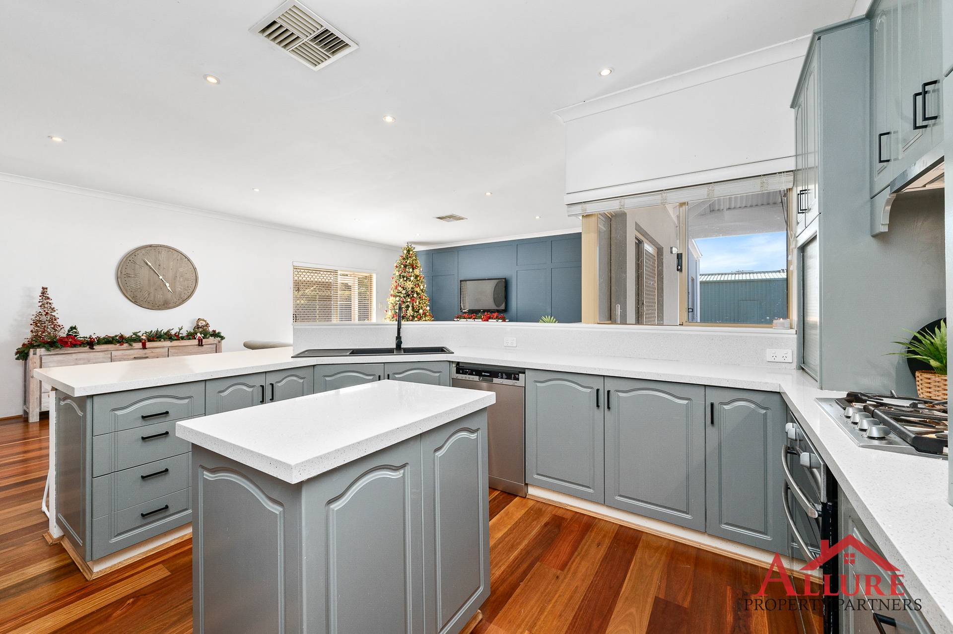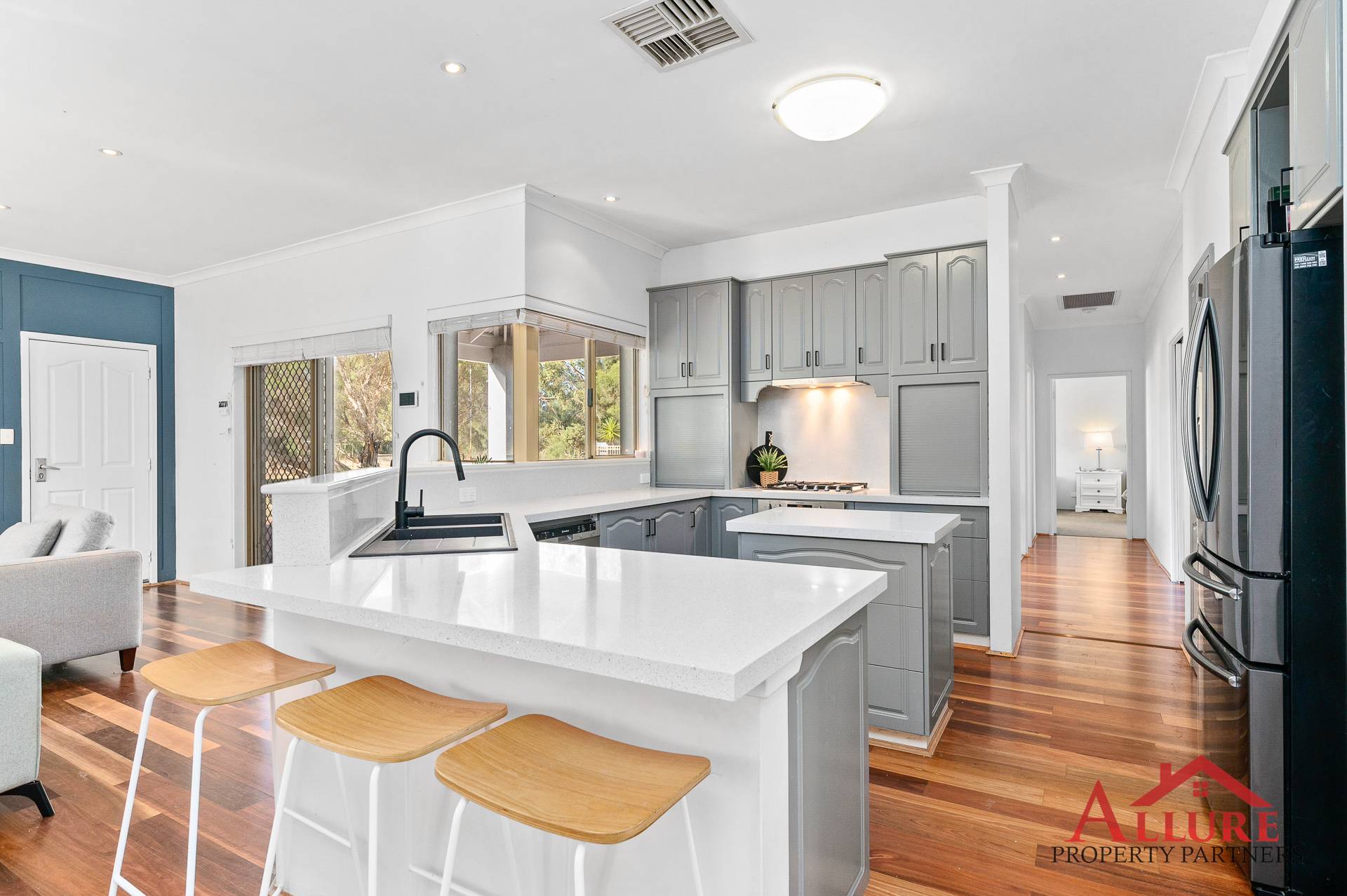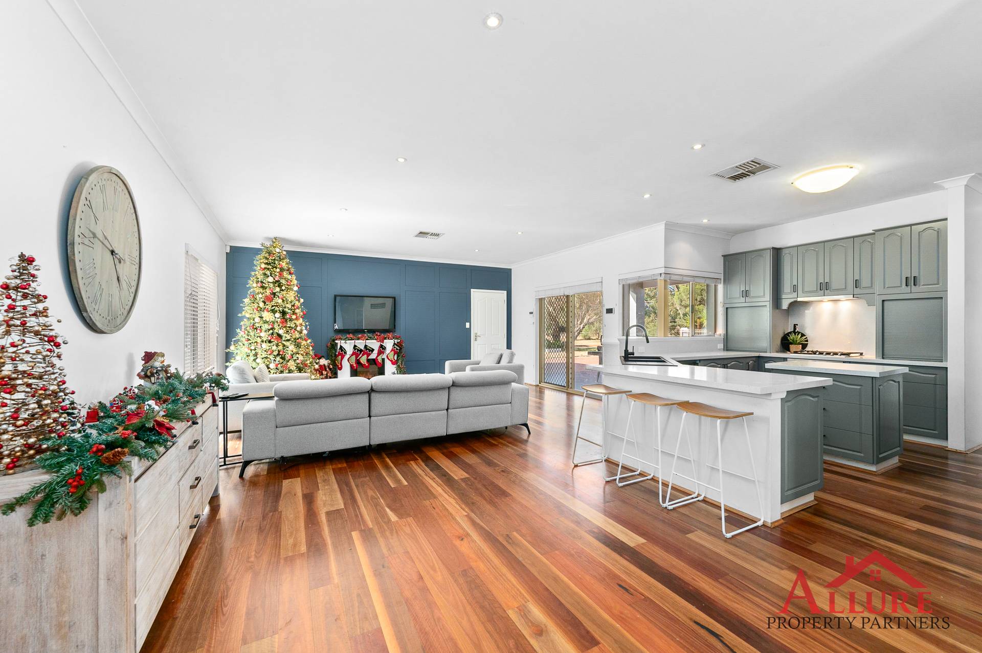 This is a fabulous entertainer’s delight, endless opportunity for formal or informal entertaining with family and friends. The home presents a sprawling open plan layout, with high ceilings throughout, collectively offering 4 bedrooms, 2-bathroom home with multiple living areas. Such as a theatre room for family movie night, an open plan study nook or activity area, a home office/ 5th bedroom. The kitchen, positioned at the heart of our home, offers a scenic view of the patio and the open-plan family living/dining space, complete with an island bench and breakfast bar.