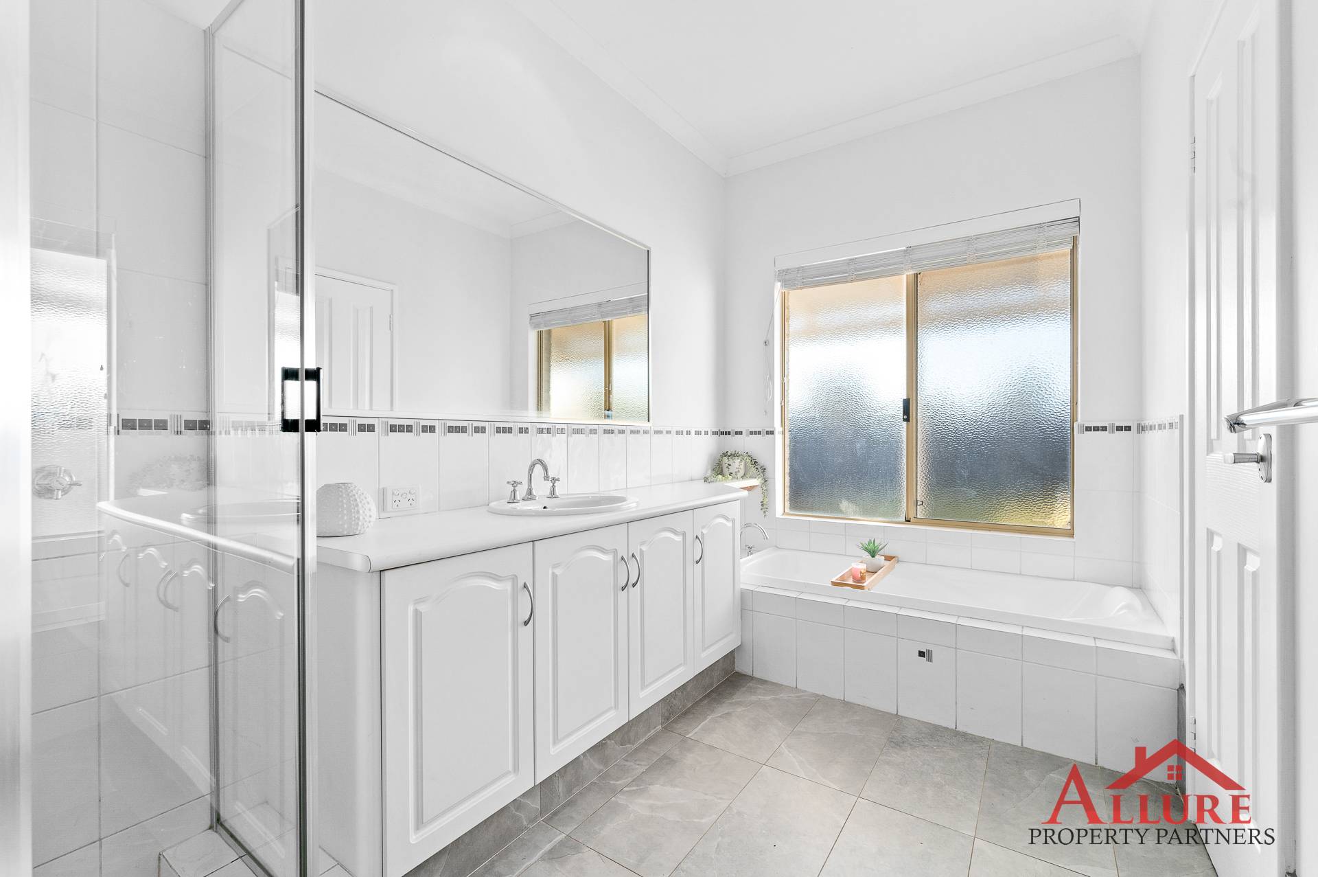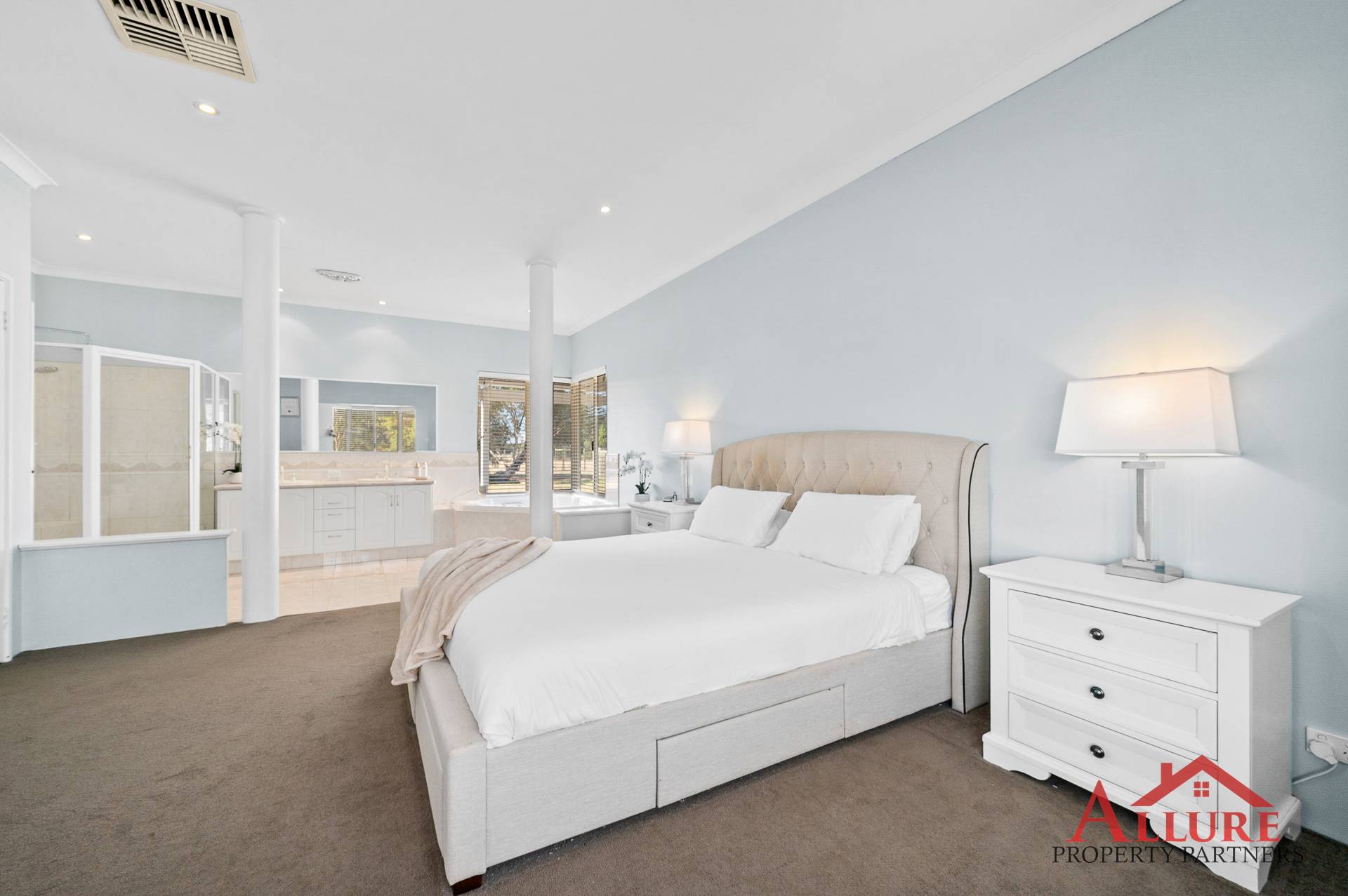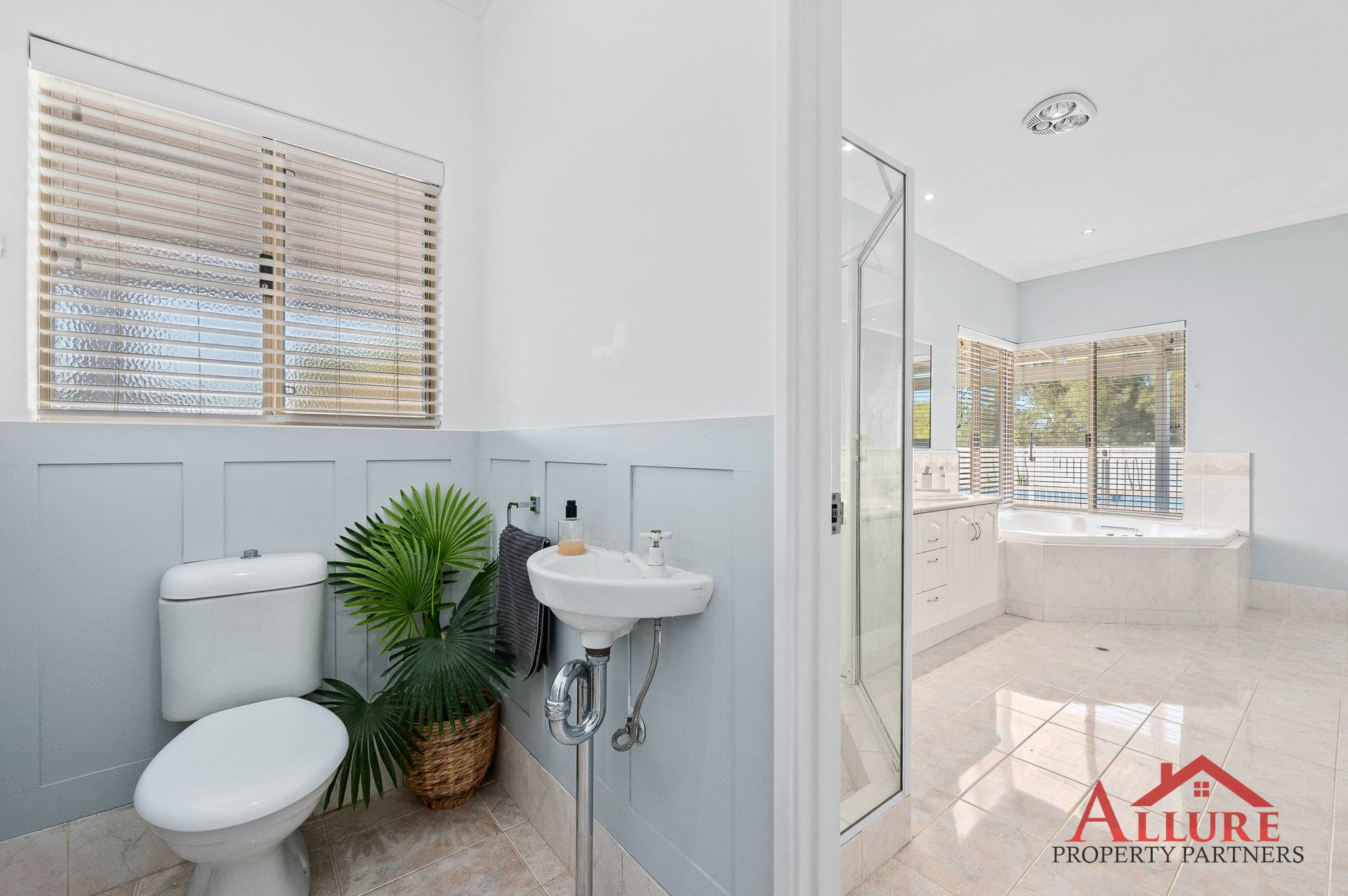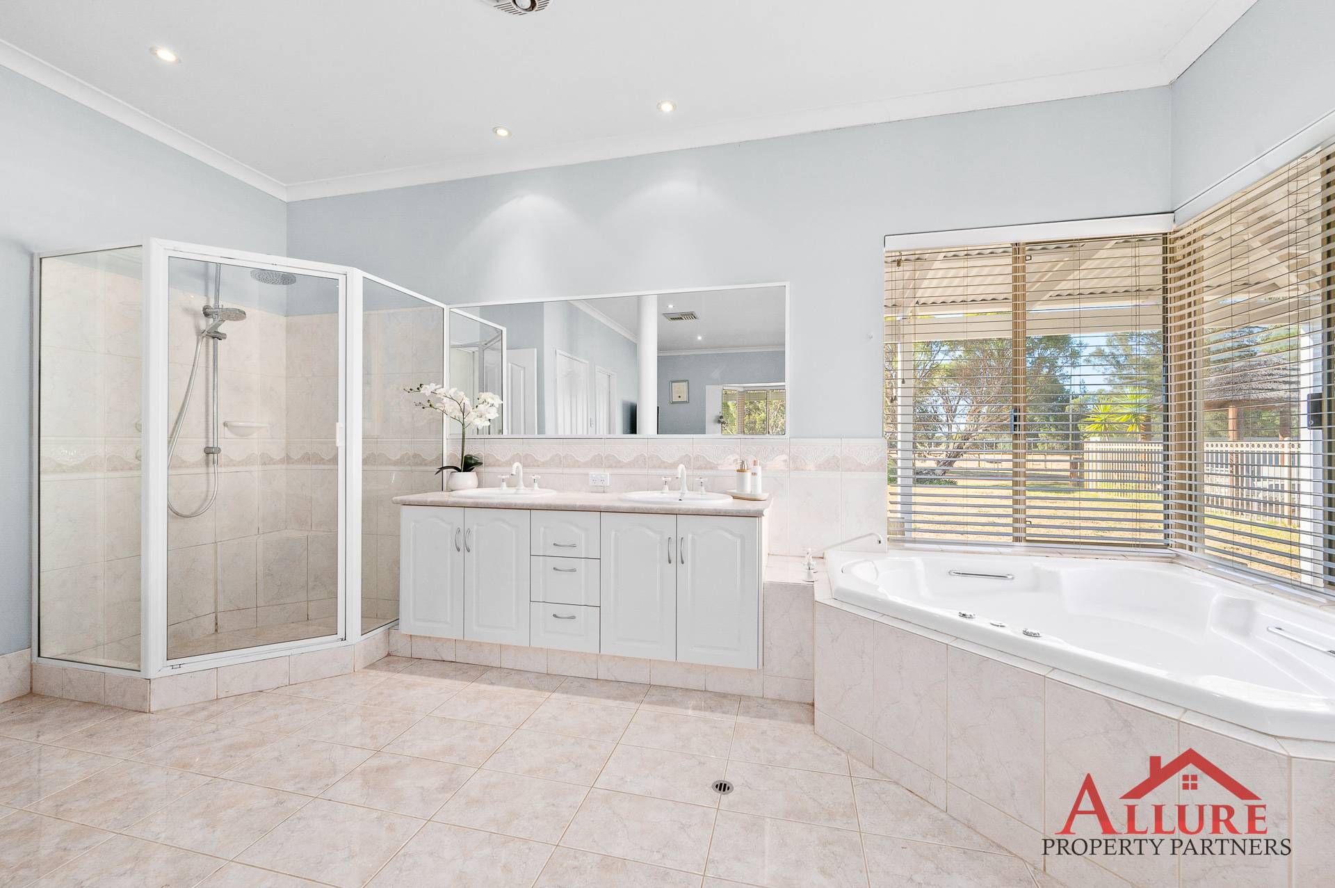 The master suite features a large walk-in robe and a luxurious en-suite bathroom complete with a corner spa bath overlooking the pool & gardens, substantial shower, double vanity, and separate toilet/powder room.