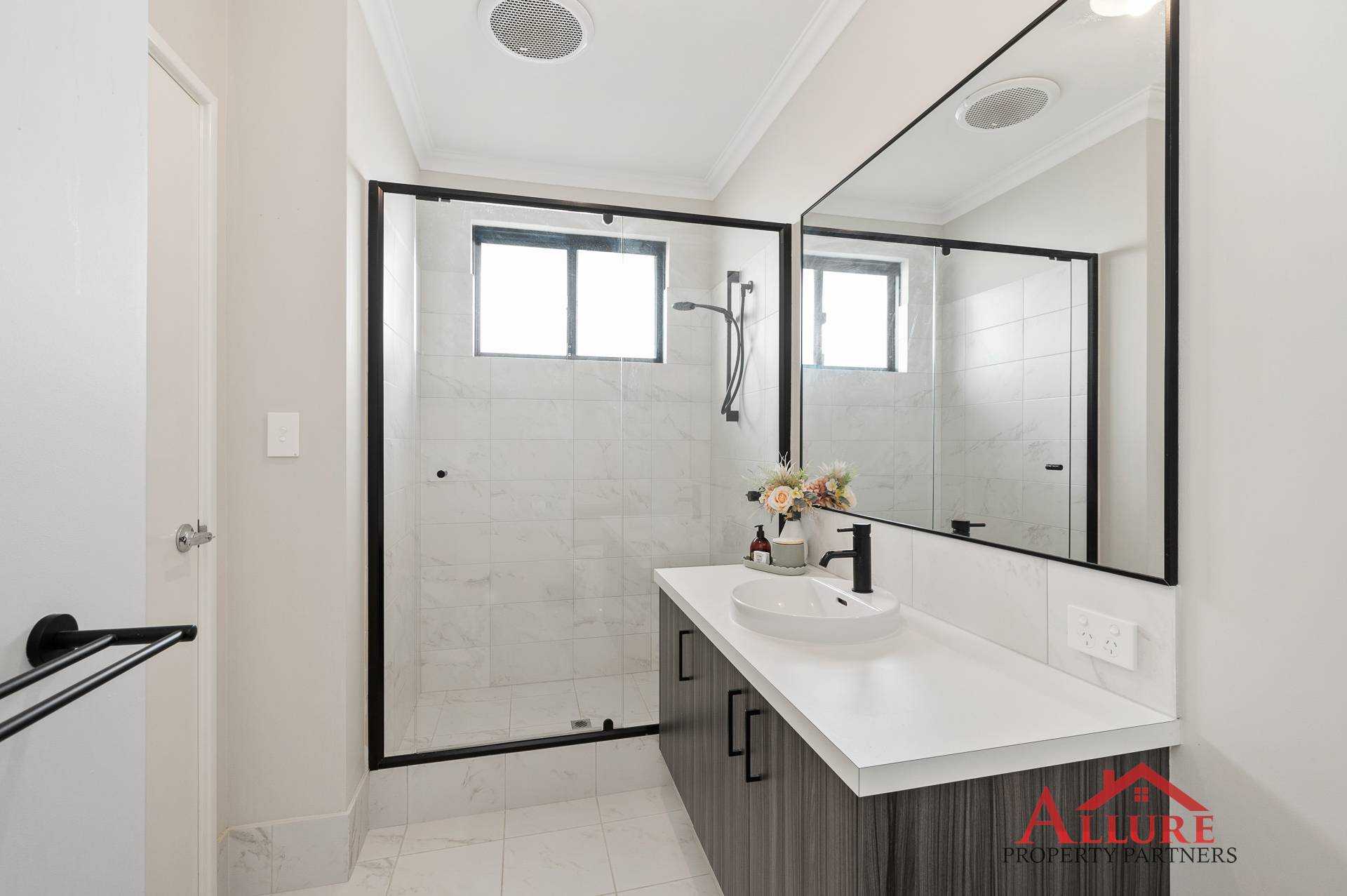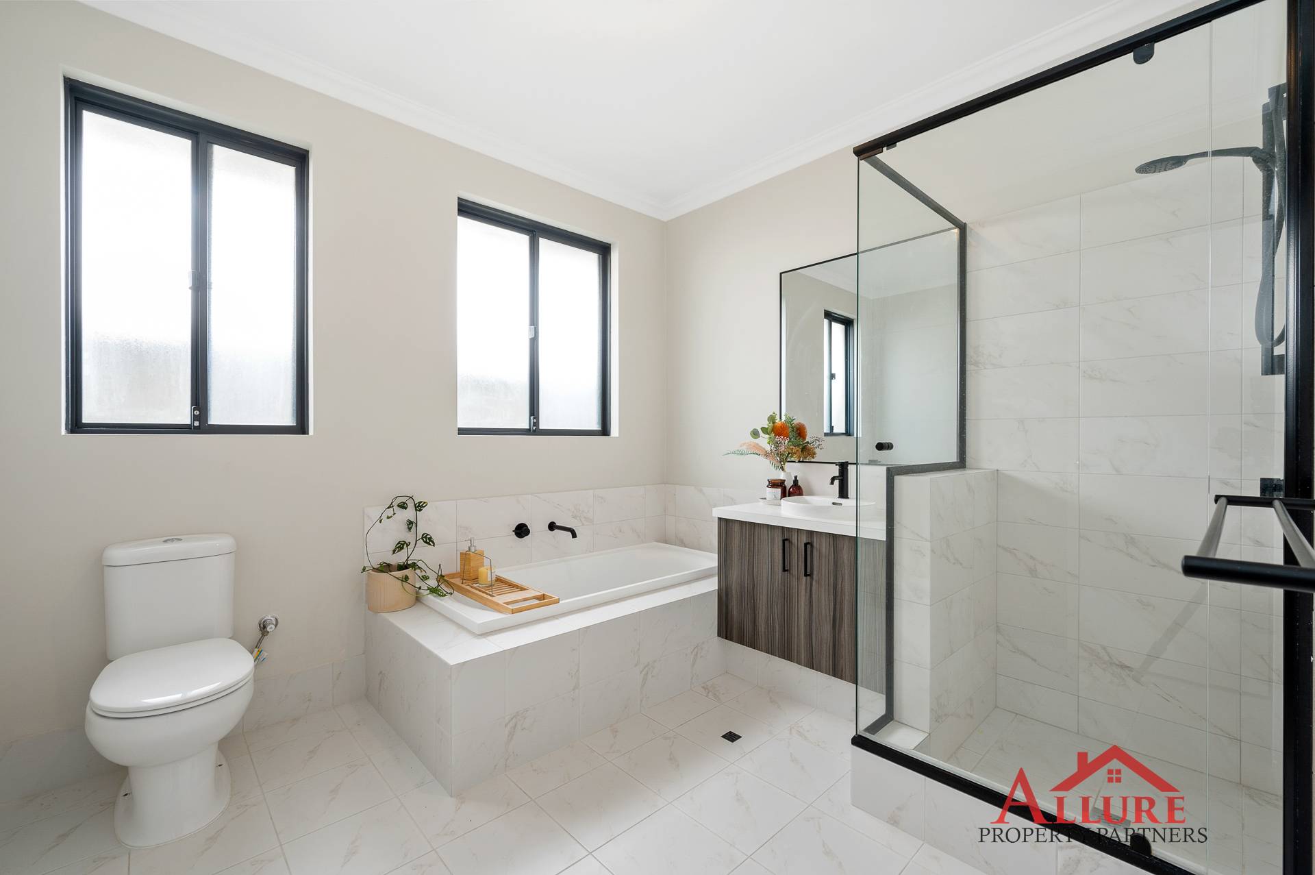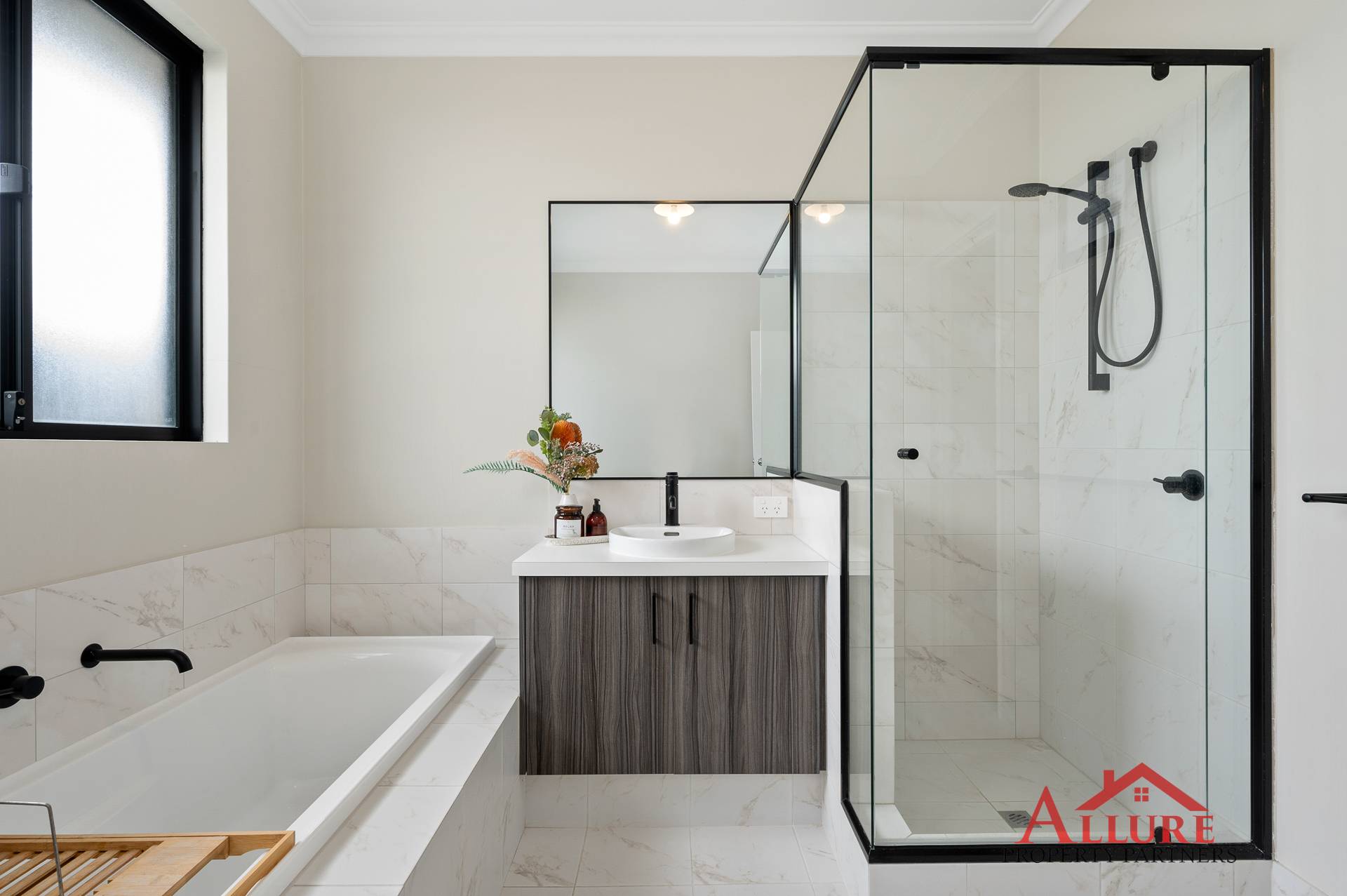 Generously Sized Bathroom: A modern and spacious design, thoughtfully created with family living in mind. Featuring sleek, contemporary finishes, a functional layout that offers both style and convenience for everyday use.