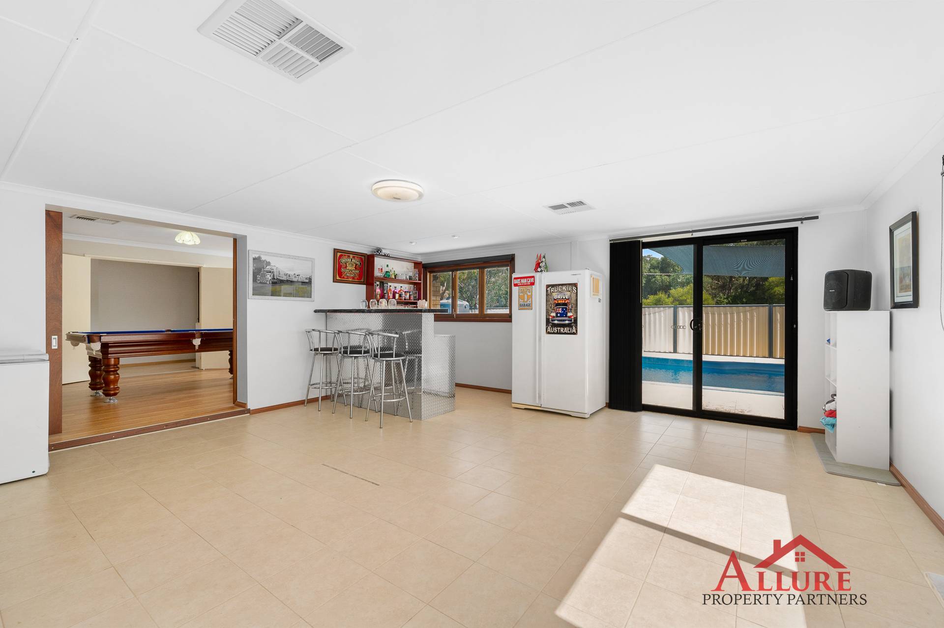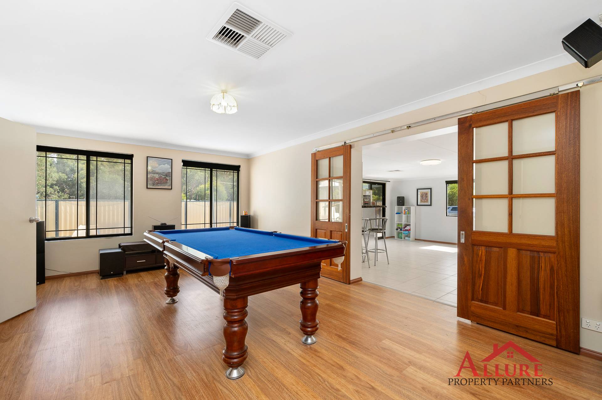 •    Expansive multiple living areas, comprises of a lounge room (currently the snooker/pool table room) which opens out into the entertaining room, a family living & dining, and a games/study room.