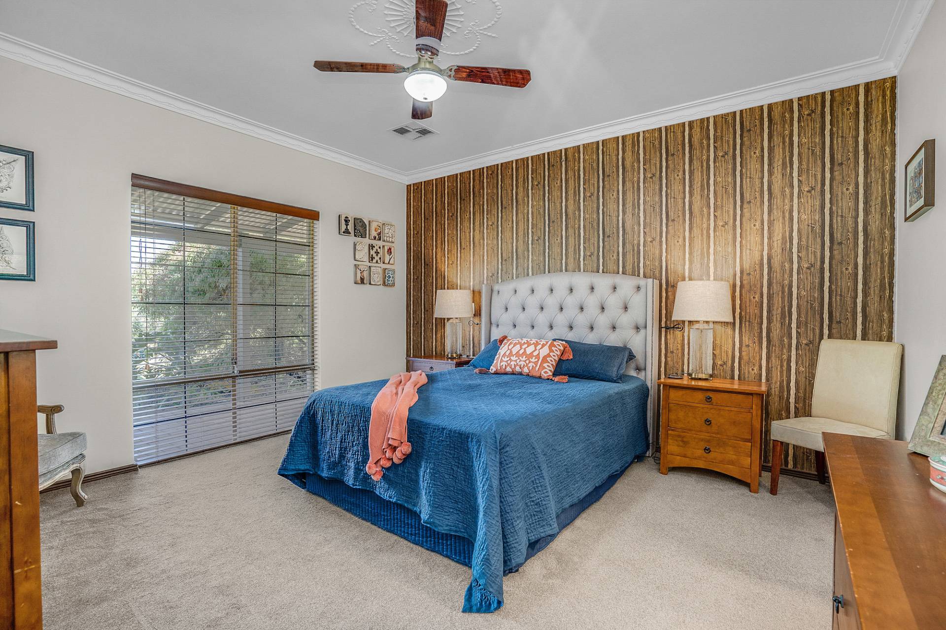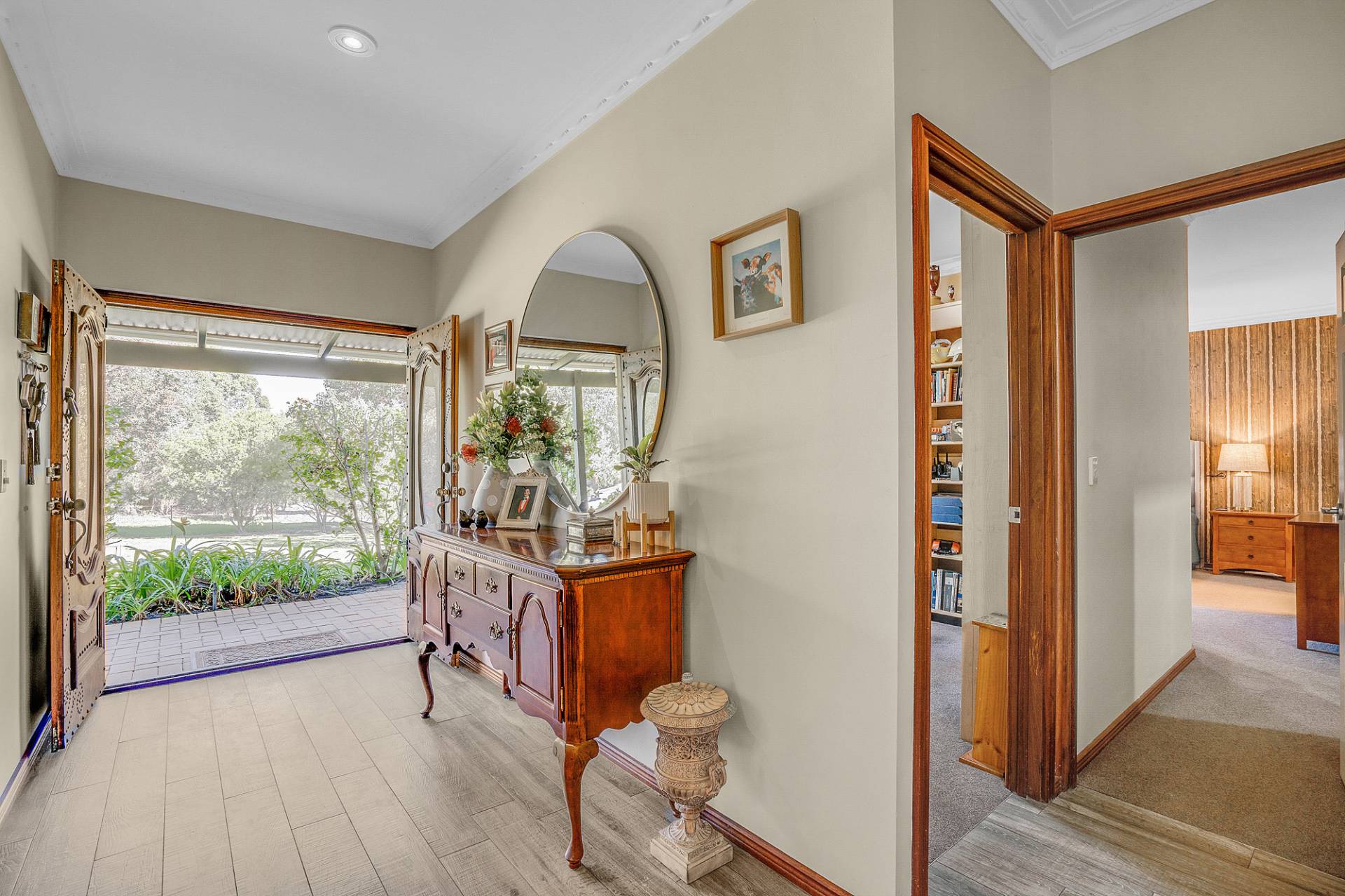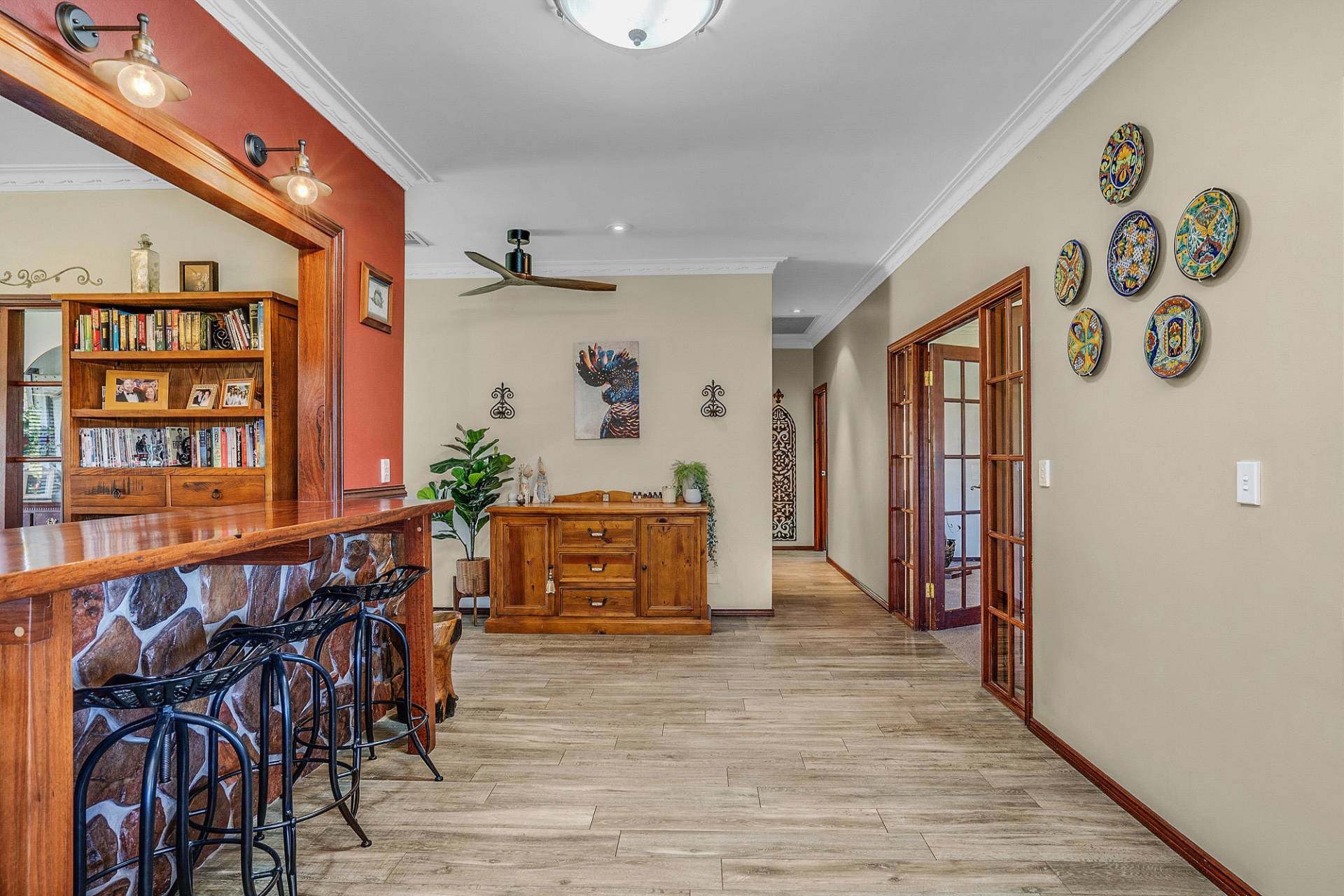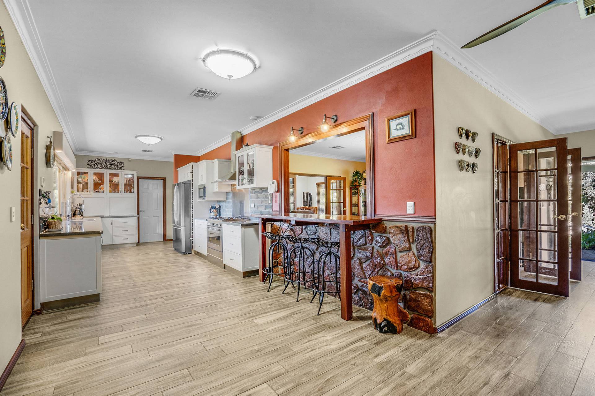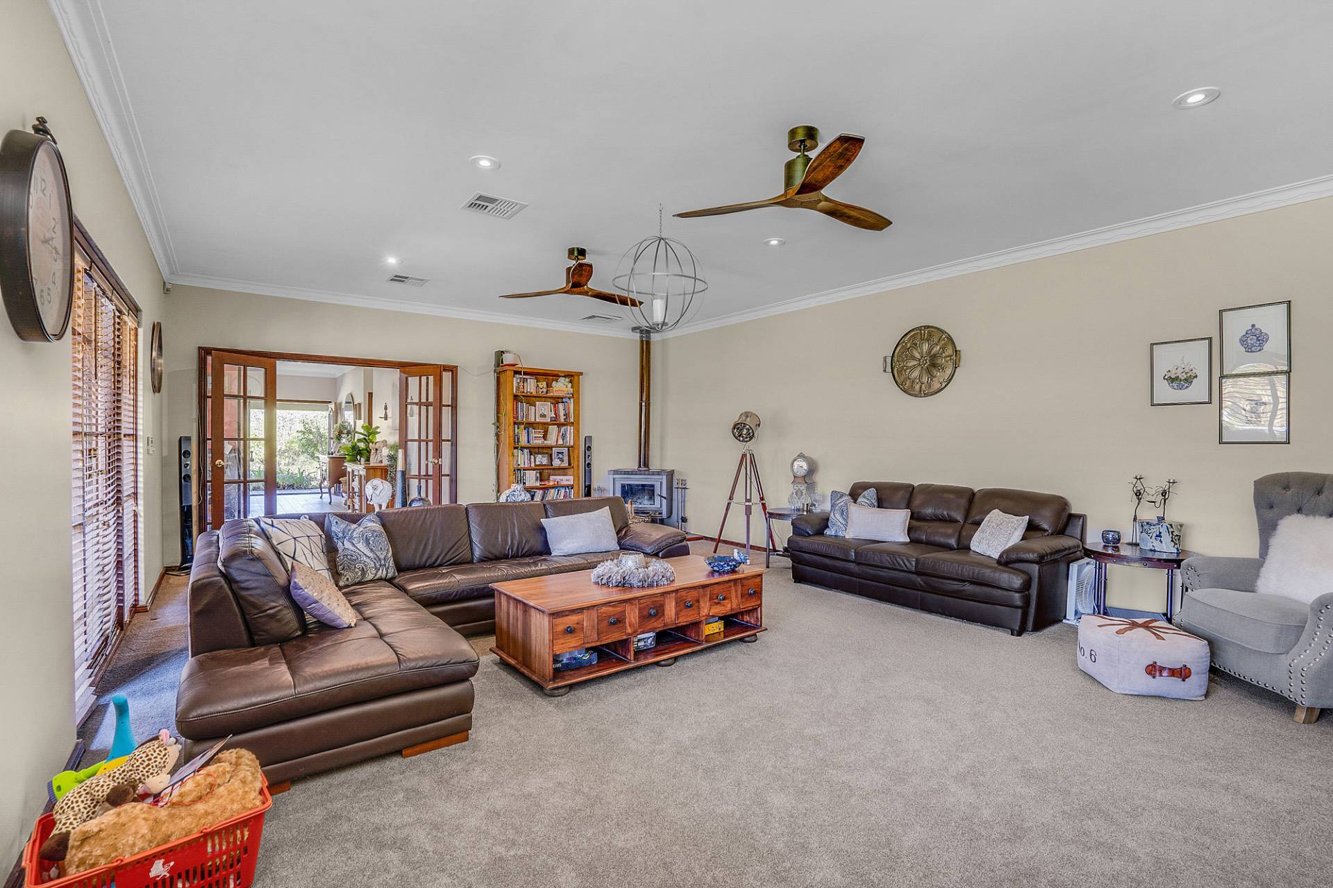 The interiors of the home are offset by a warm neutral colour scheme that combine to construct this lavish family home finished to superior standards. The beautiful French doors throughout the home add an elegant charm, together with opulent ceiling architecture and the beautiful Jarrah wood burning fire, accentuates a cozy country ambiance to the home. Soak up all year-round comfort with the ducted reverse cycle air-conditioning and ceiling fans. This home would certainly sit comfortably in any interior designer magazine.