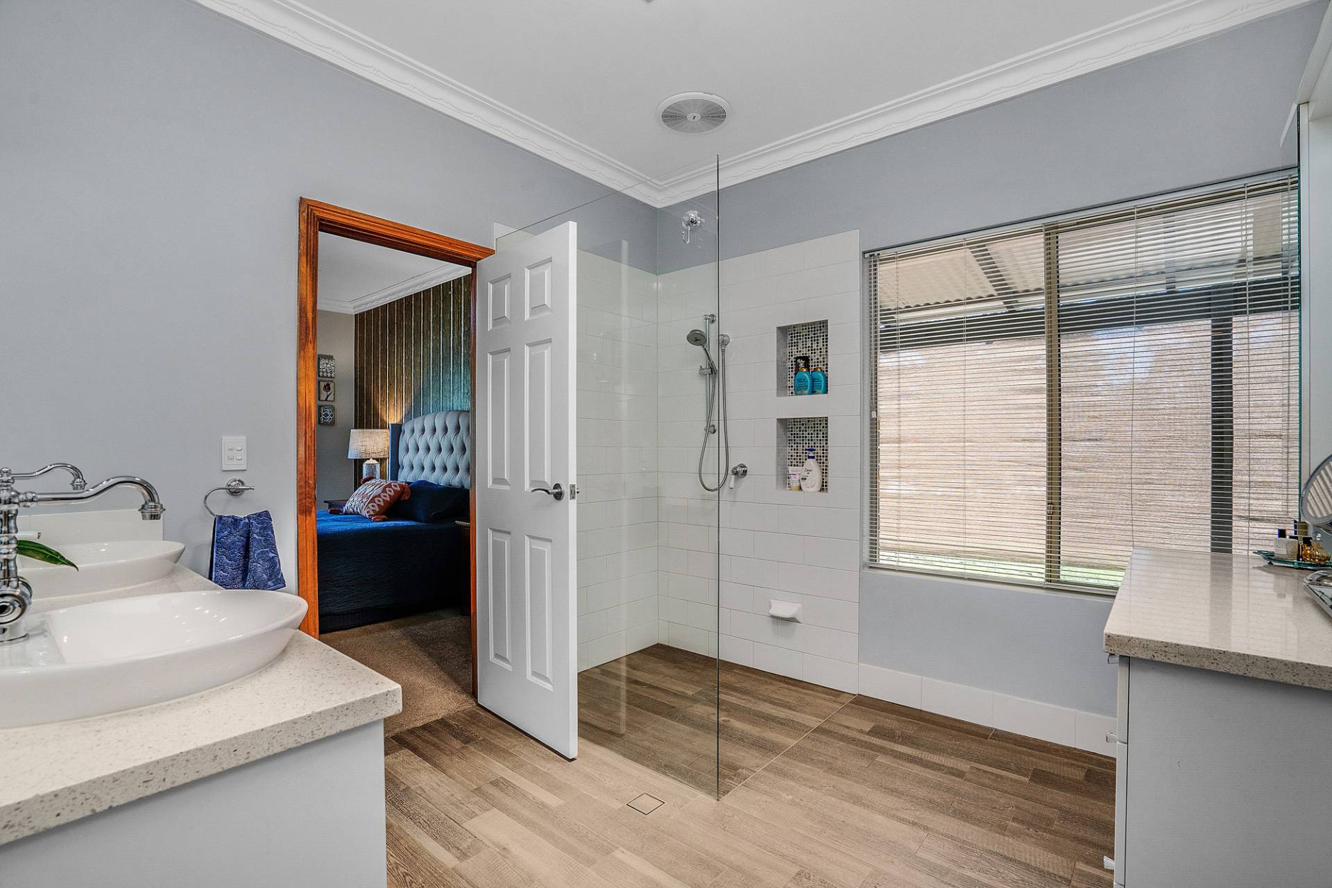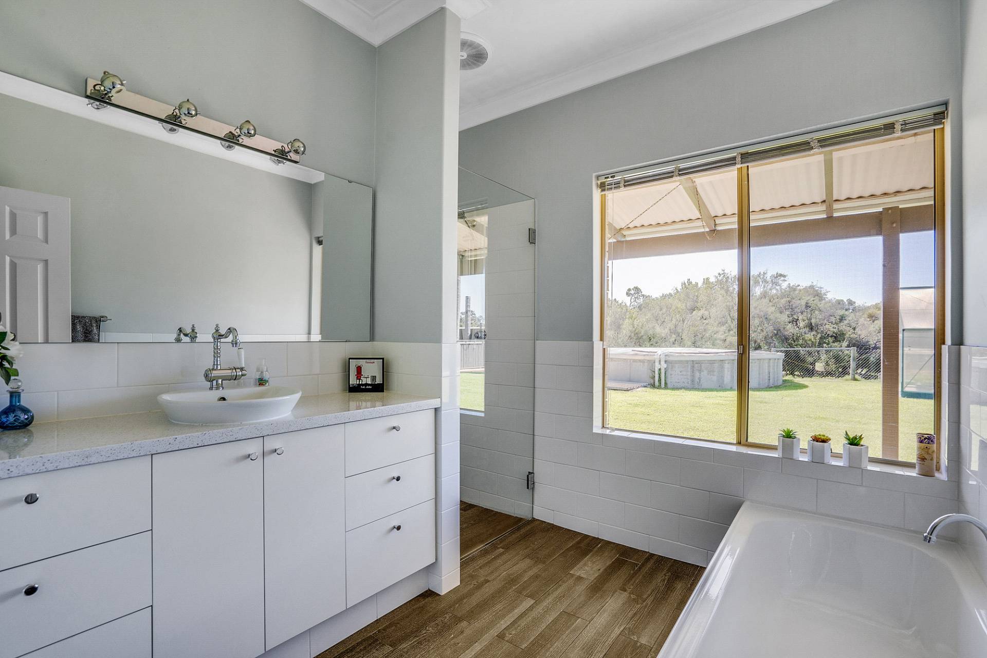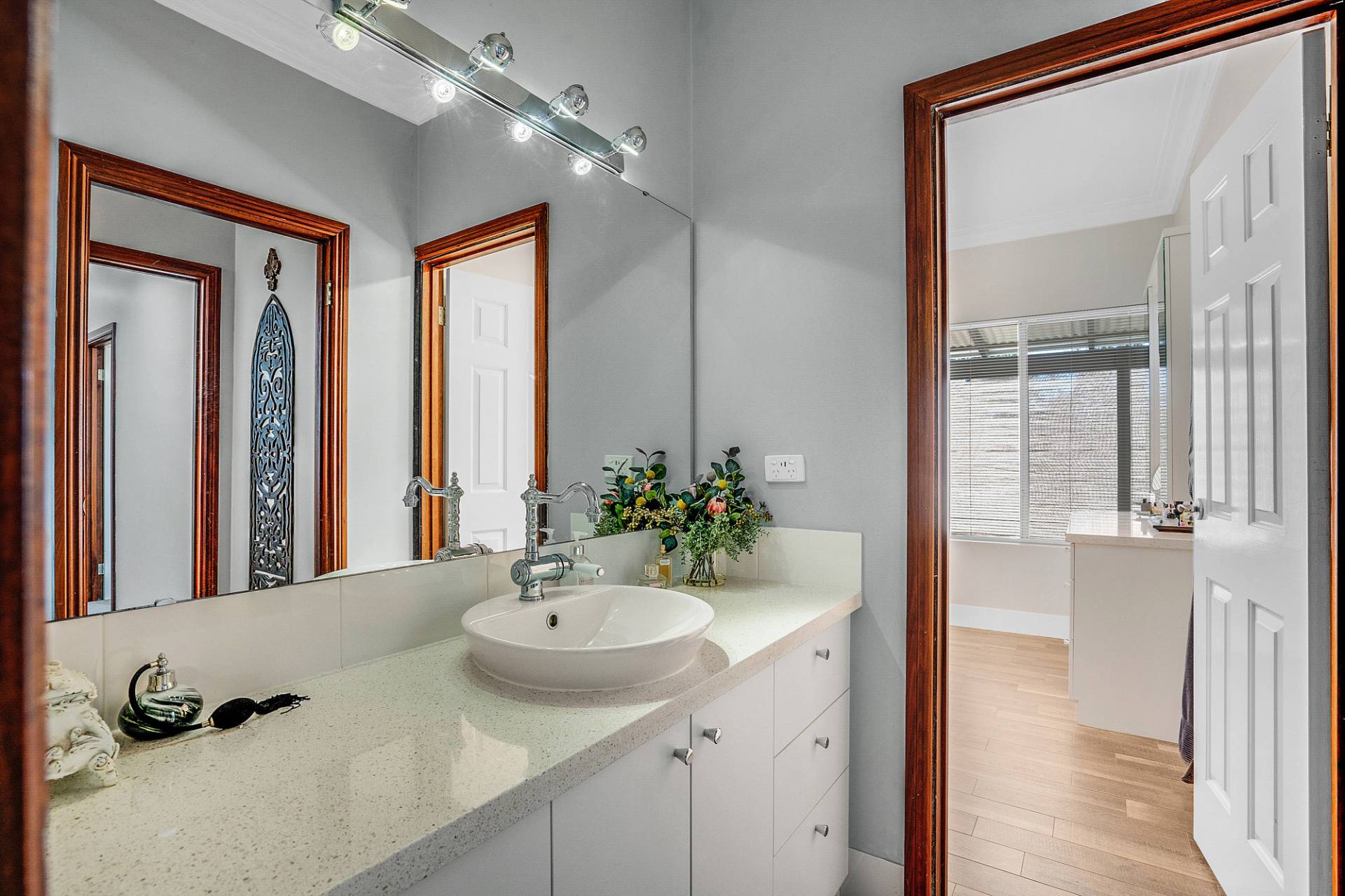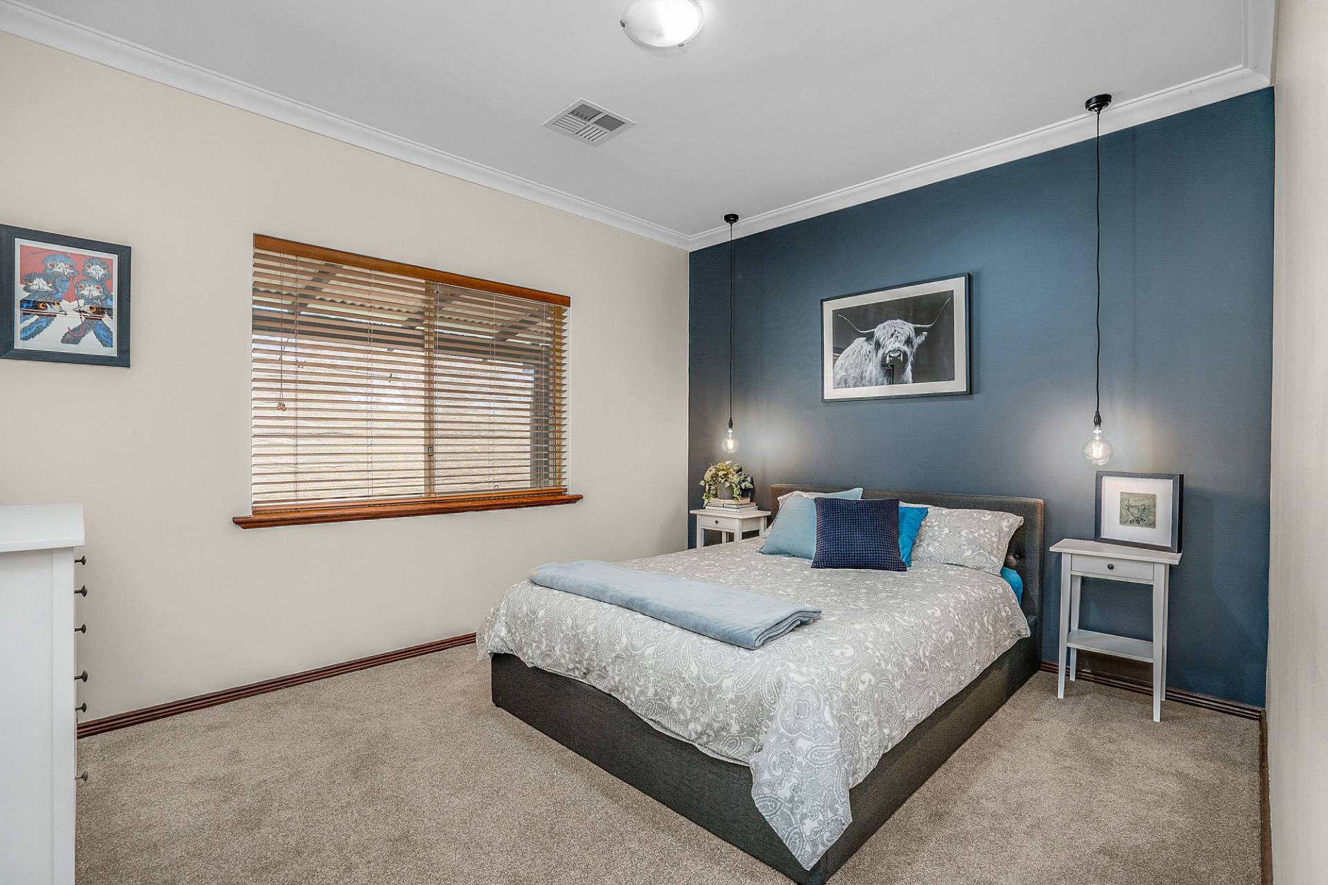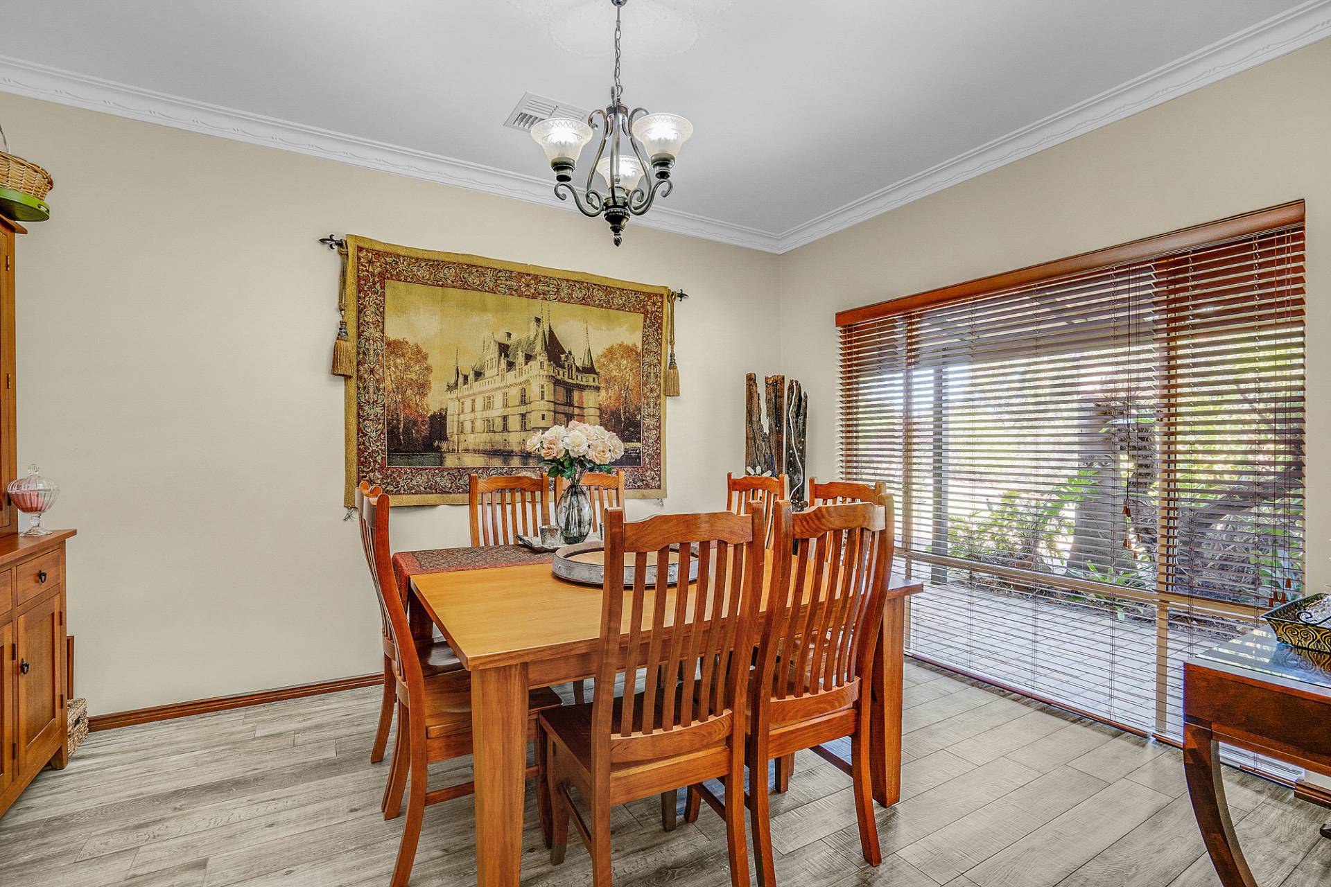 The interiors of the home are offset by a warm neutral colour scheme that combine to construct this lavish family home finished to superior standards. The beautiful French doors throughout the home add an elegant charm, together with opulent ceiling architecture and the beautiful Jarrah wood burning fire, accentuates a cozy country ambiance to the home. Soak up all year-round comfort with the ducted reverse cycle air-conditioning and ceiling fans. This home would certainly sit comfortably in any interior designer magazine.