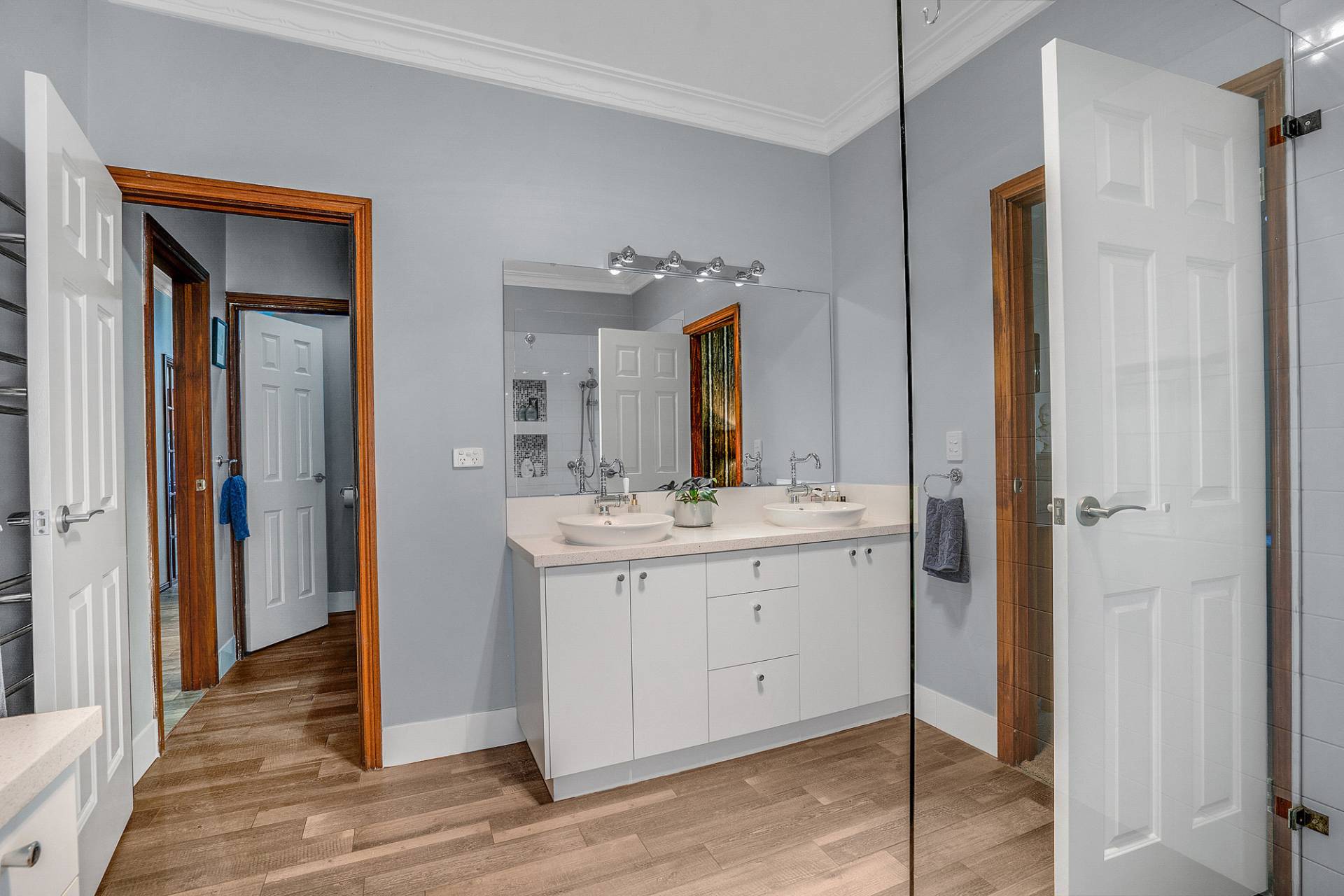 The home oozes style and charm, together with the opulent architecture, elegance and excellence of craftsmanship that is portrayed throughout the home. Collectively the home offers 4 generous sized bedrooms all with built in robes, 2 bathrooms, Kitchen, powder room, a study/home office, 3 living zones and well fitted out laundry. The king-sized master suite showcases a huge walk-in robe complete with under shelf lighting, an exquisite en-suite with dual vanities, shower recess, mirrored dressing table and separate toilet with an elegant powder room. The remaining 3 bedrooms all with double robes are serviced by the second bathroom.