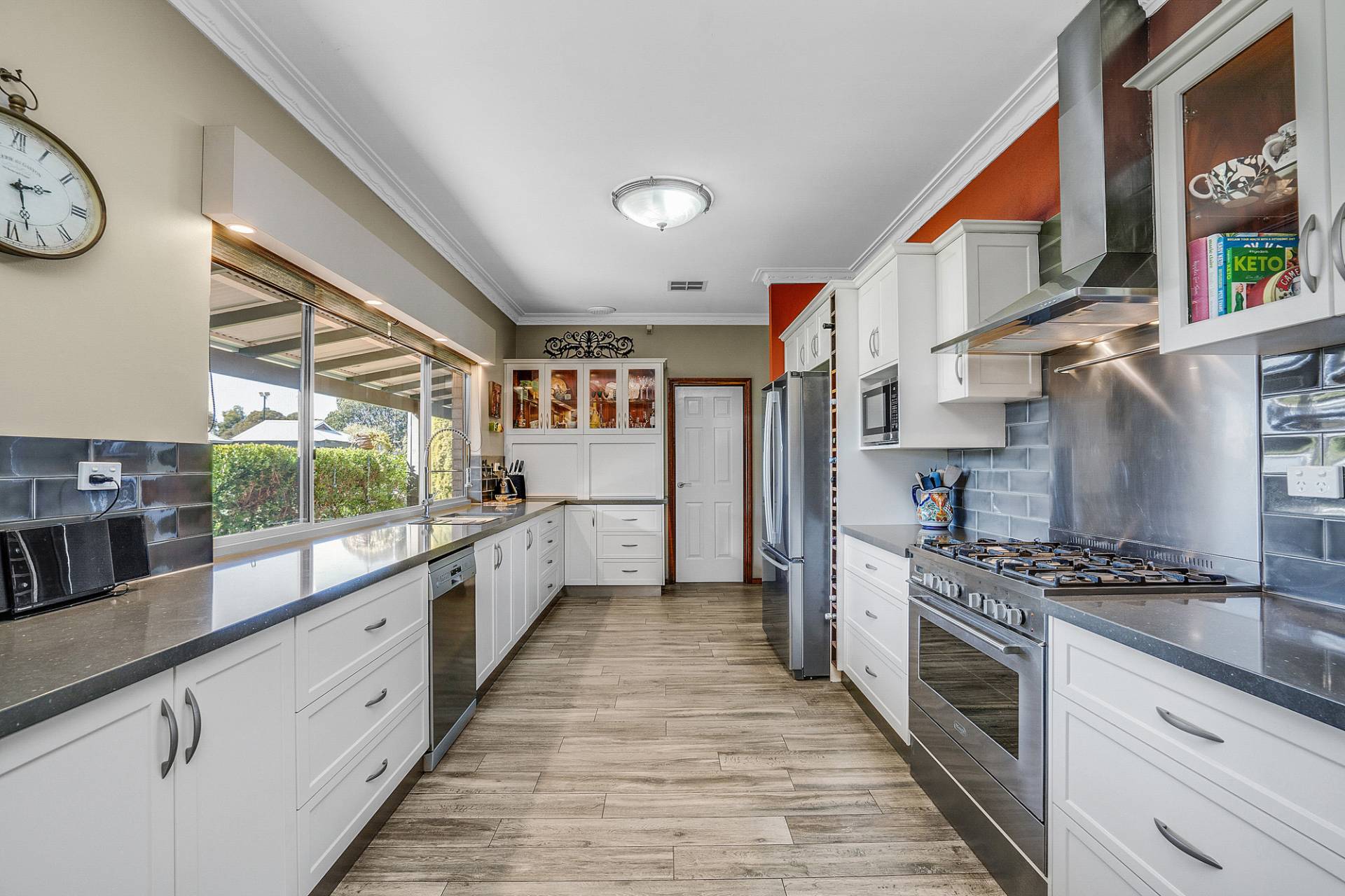 The chef of the family will love cooking in this classic style extensive galley kitchen, located at the helm of the home overlooking the swimming pool, gardens and patio, boasting ample storage, stone bench tops, quality cooking appliances and an enormous walk-in pantry/utility cupboard any chef would envy.