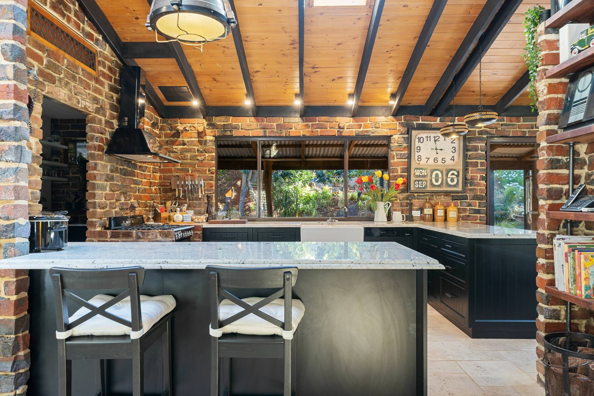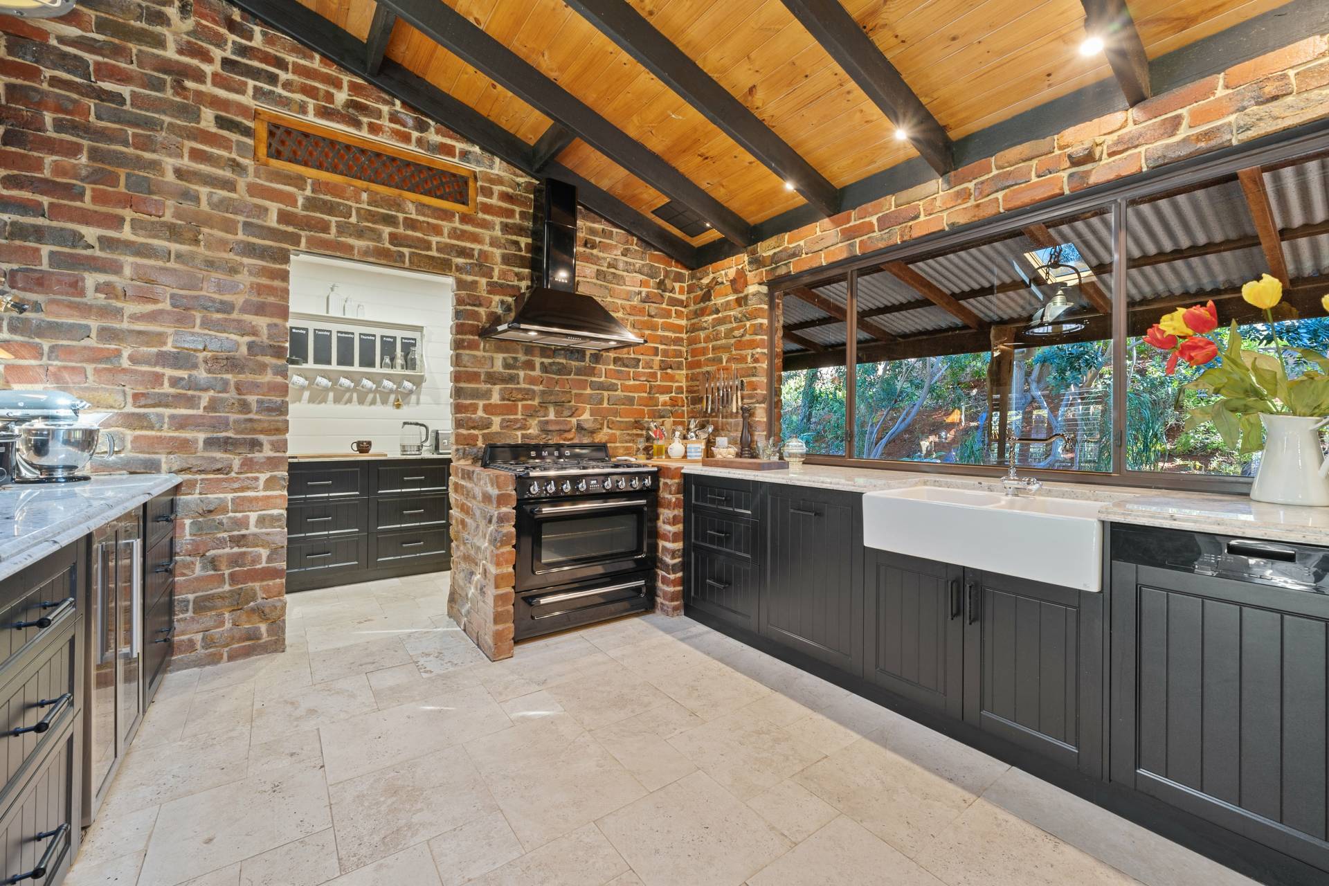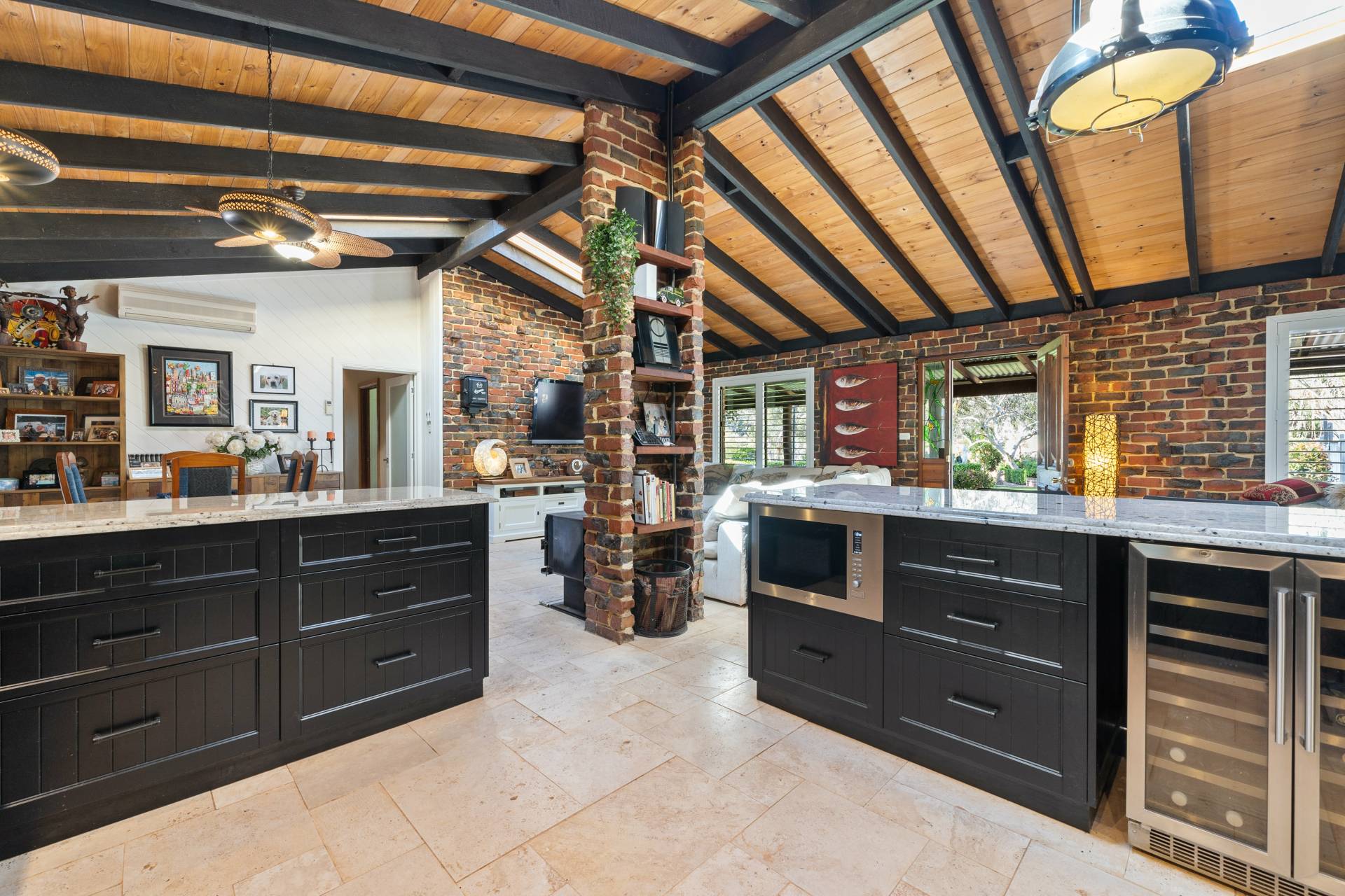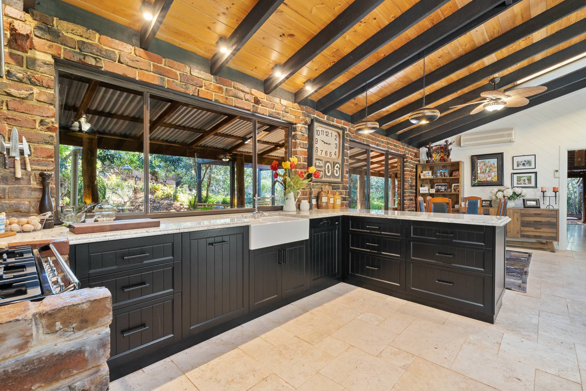 Collectively the home offers 3 good size bedrooms, 2 bathrooms, a study/home office. The king-sized master suite comprises of a spacious walk-in robe, fabulous en-suite bathroom with floor to ceiling tiling, double vanities, a substantial sized shower and separate toilet, the remaining 2 bedrooms are serviced by the second incredibly, styled bathroom comprising of a free-standing bath, wash basin, shower, toilet, built in TV and a stylish European laundry discreetly hidden away with linen storage. The chef of the family will love cooking in this classic country style kitchen with quality SMEG & Miele appliances, located at the helm of the home overlooking the family /dining area, boasting ample storage, together with a spacious chef scullery and pantry, a substantial sized custom built granite breakfast bar and a bounty of bench top space every chef dream of. The open plan family living designed with exposed beams, raked ceilings, rattan ceiling fans and sky lights.