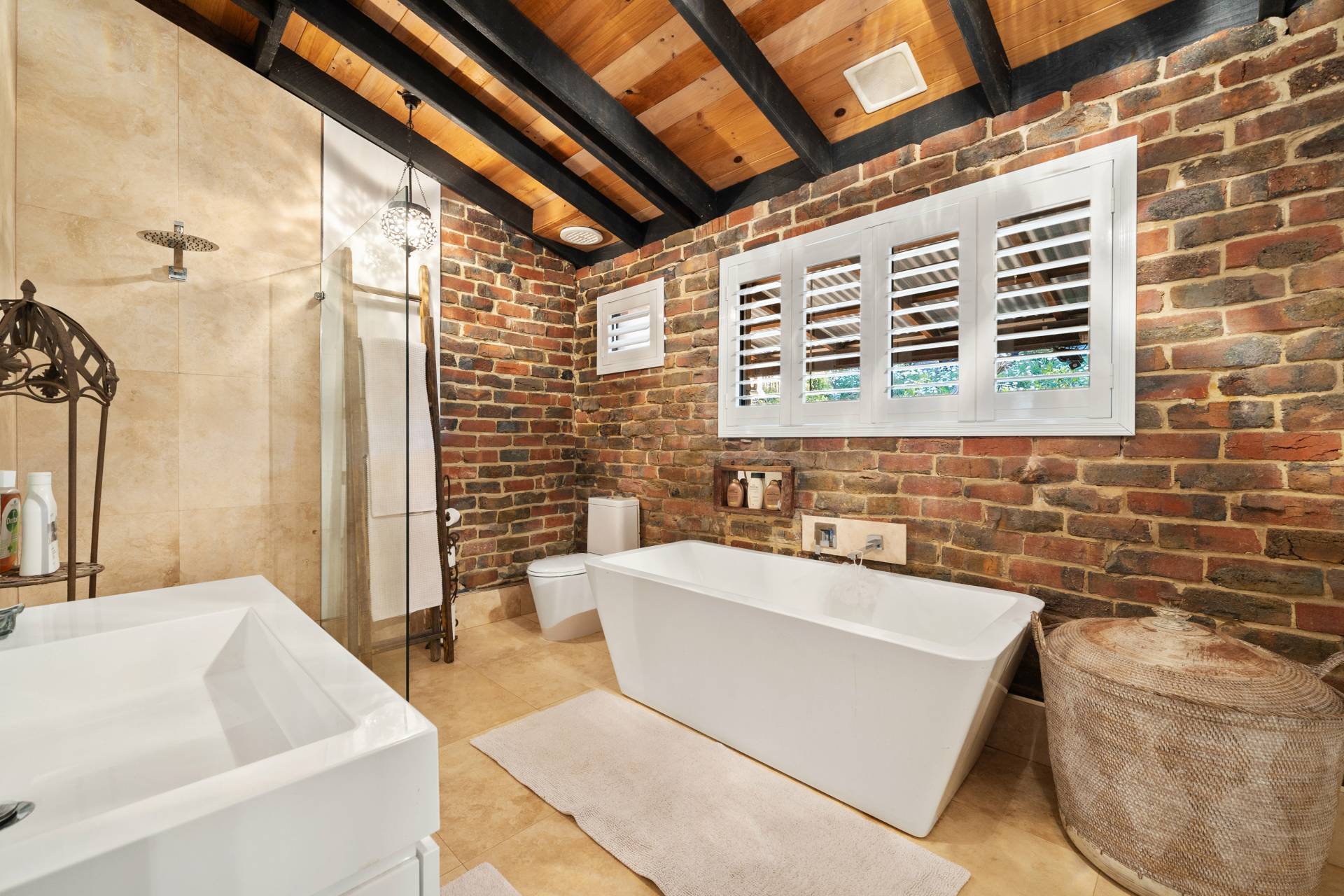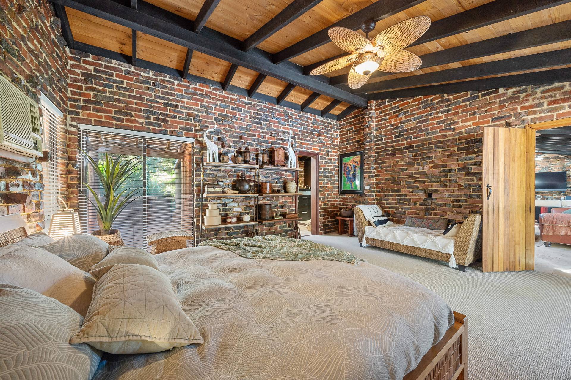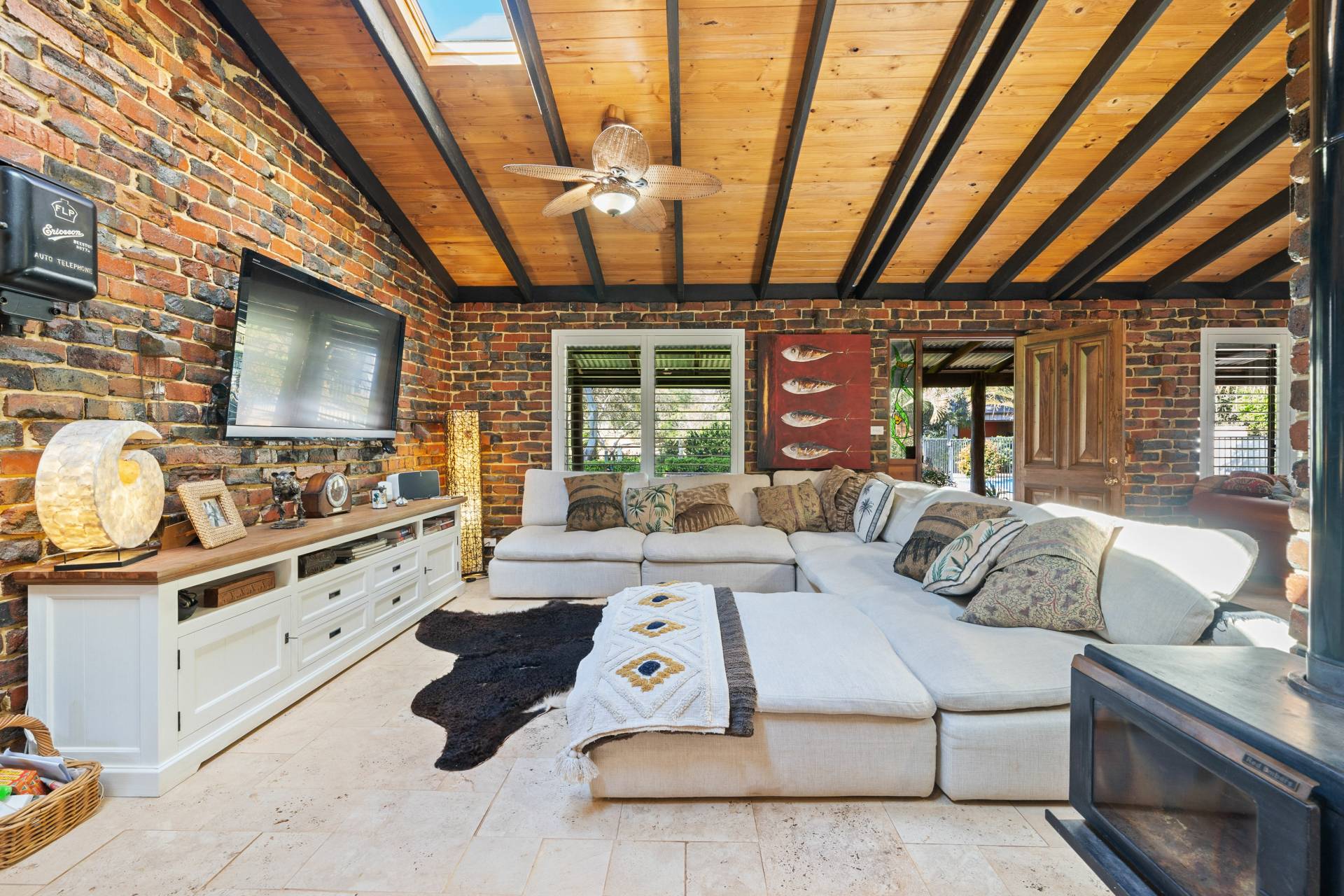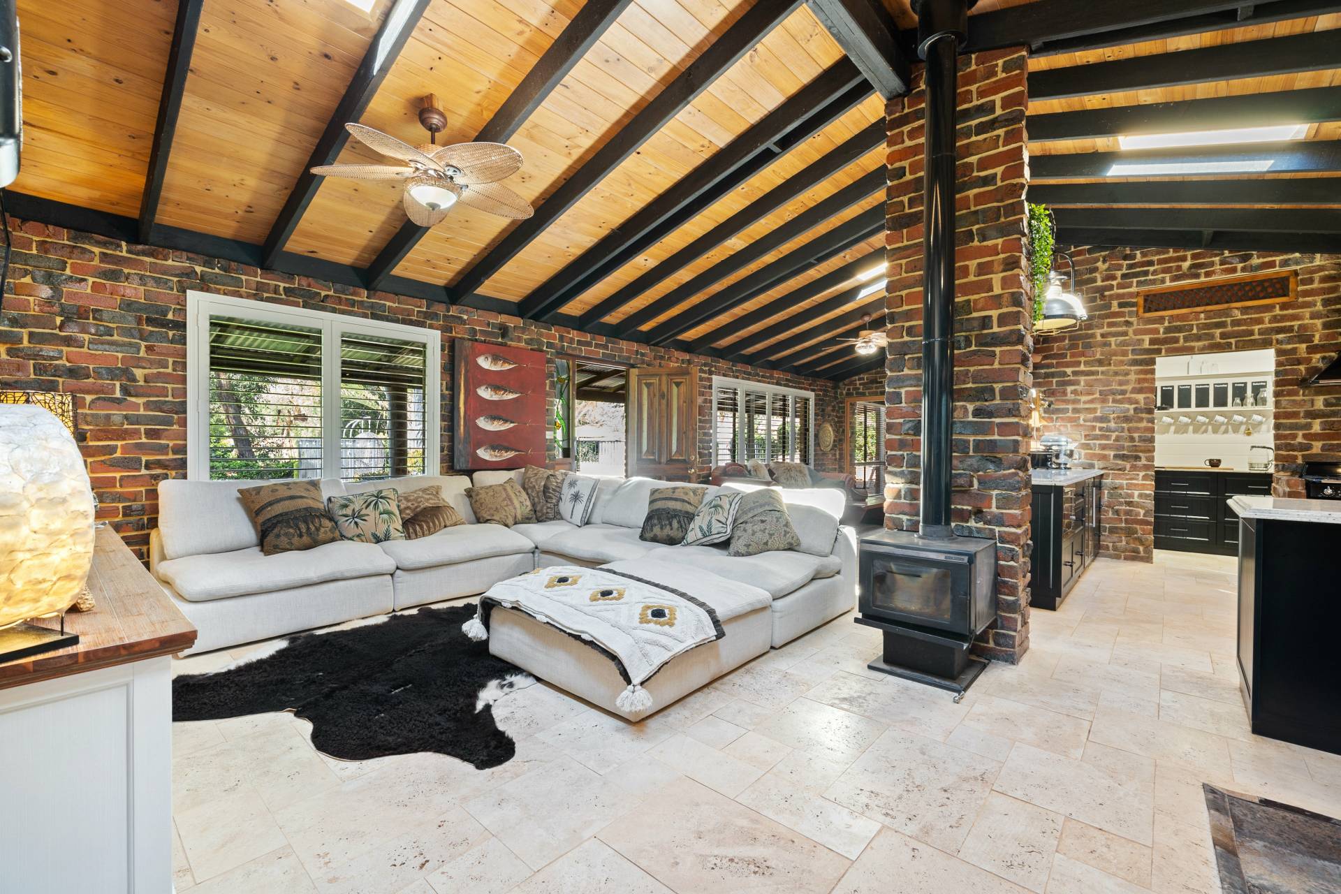 Collectively the home offers 3 good size bedrooms, 2 bathrooms, a study/home office. The king-sized master suite comprises of a spacious walk-in robe, fabulous en-suite bathroom with floor to ceiling tiling, double vanities, a substantial sized shower and separate toilet, the remaining 2 bedrooms are serviced by the second incredibly, styled bathroom comprising of a free-standing bath, wash basin, shower, toilet, built in TV and a stylish European laundry discreetly hidden away with linen storage. The chef of the family will love cooking in this classic country style kitchen with quality SMEG & Miele appliances, located at the helm of the home overlooking the family /dining area, boasting ample storage, together with a spacious chef scullery and pantry, a substantial sized custom built granite breakfast bar and a bounty of bench top space every chef dream of. The open plan family living designed with exposed beams, raked ceilings, rattan ceiling fans and sky lights.