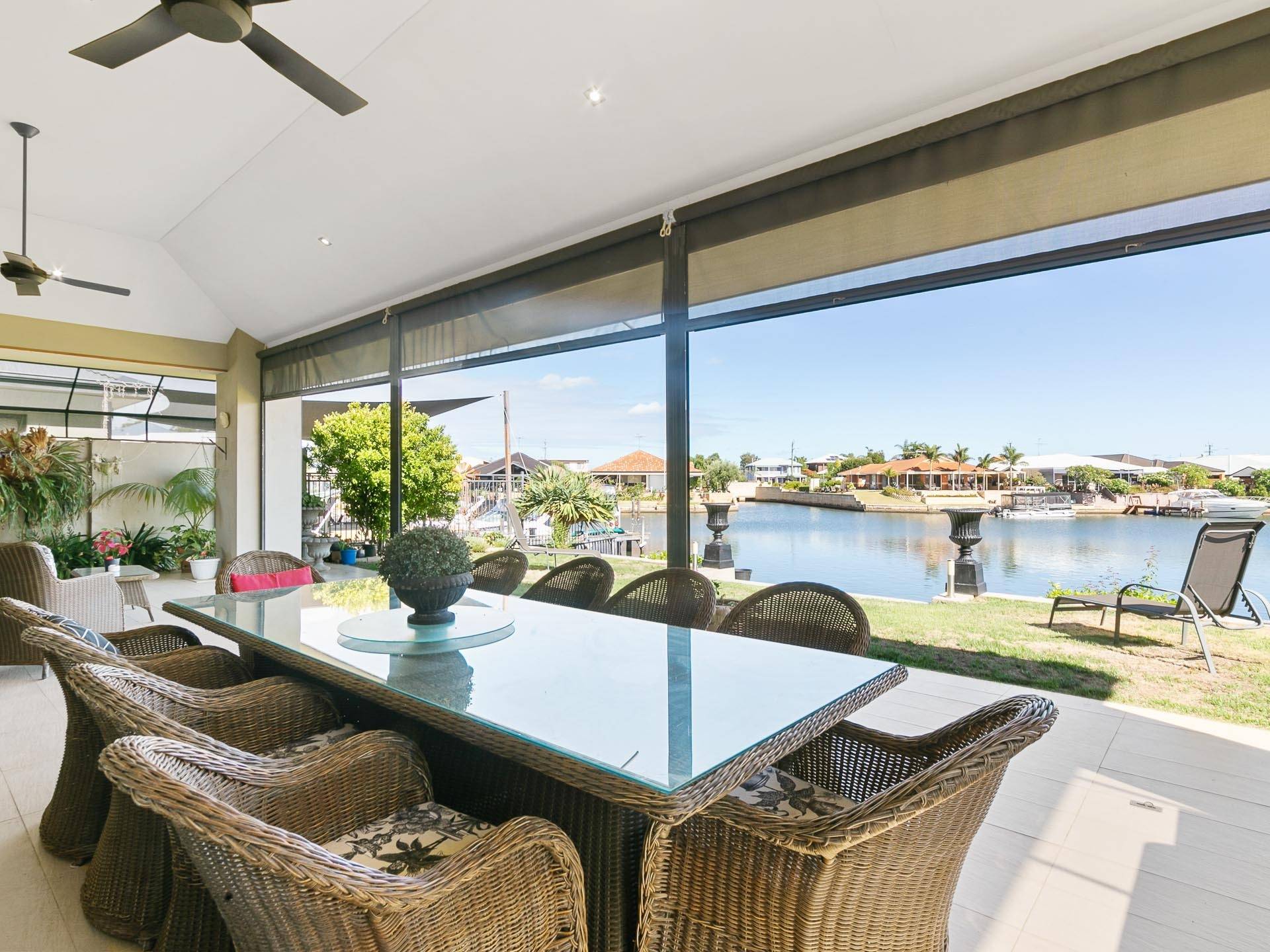 The family living area opens out onto the fantastic alfresco, for endless entertaining with family and friends, relaxing and enjoying the amazing panoramic views of the dolphins frollocking through the canal, complete with built in BBQ, ceiling fans, café blinds.